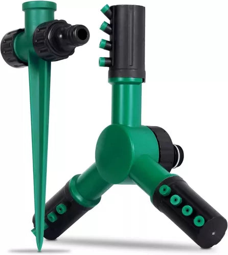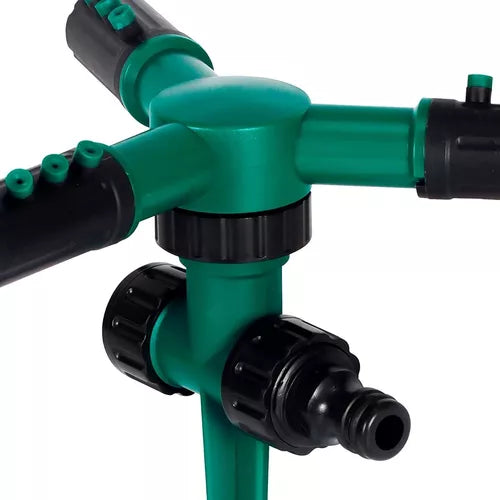 Ideal para irrigação de gramados, jardins e hortas. Movimenta-se pela pressão da água. Aspersão regulável dos jatos com um pequeno giro nas extremidades dos 3 braços. Haste com formato próprio para fixação no solo.